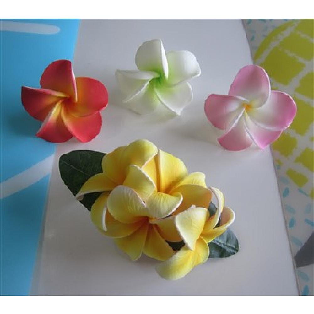 - 1 "Aloha Plumeria Clip" (Color - "Lilikoi") ~ Plumerias - Approx. 2 1/2 inches. Clear Clip with leaf - Approx. 4 1/2 inches wide